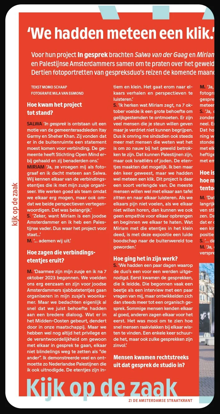 “In Conversation” is an initiative of the Amsterdam City Council. It was launched following the adoption of a motion in November 2023 by councillors Itay Garmy and Sheher Khan. The motion urges the municipal executive to actively counter the dehumanisation of Amsterdam residents affected by rising antisemitism and anti-Muslim discrimination. The initiative seeks to give these residents a face by sharing their personal stories — fostering understanding, empathy, and connection across communities.